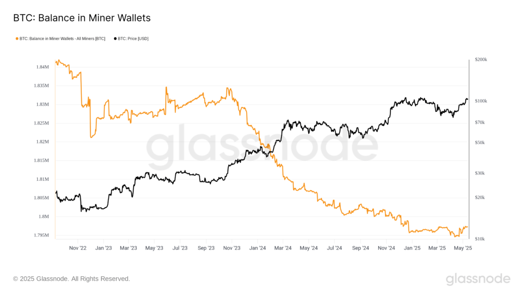 در تاریخ ۱۲ آپریل (۲۳ فروردین)، ماینرها در مجموع ۱,۷۹۴,۶۲۲ BTC در کیف پولهایشان داشتند. تا تاریخ ۱۳ می (۲۳ اردیبهشت)، این مقدار – با افزایش ۲,۷۰۸ بیت کوین یا رشد ۰.۱۵٪ – به ۱,۷۹۷,۳۳۰ BTC رسید.