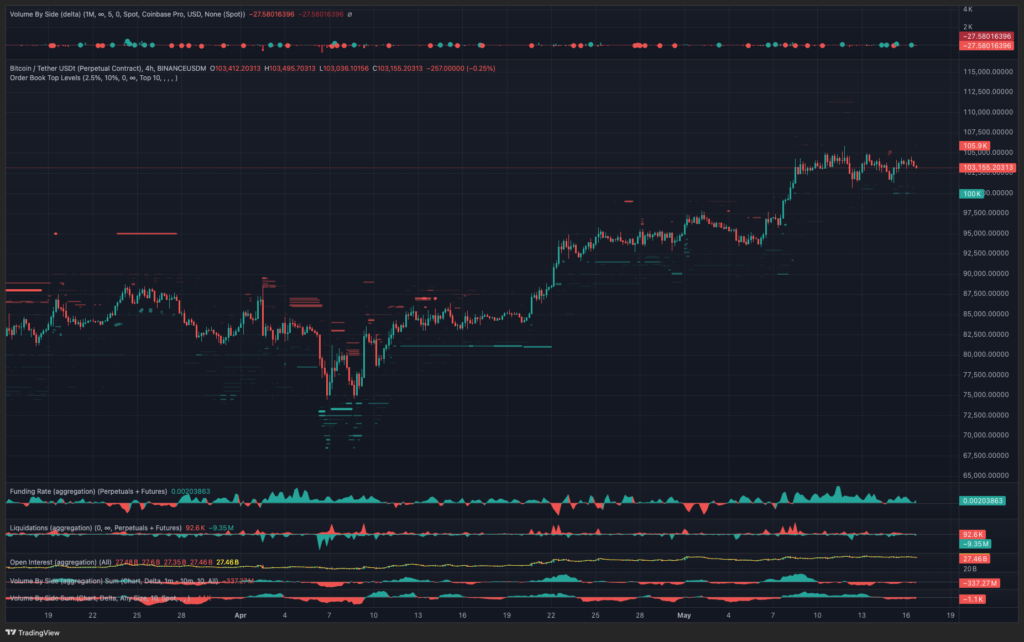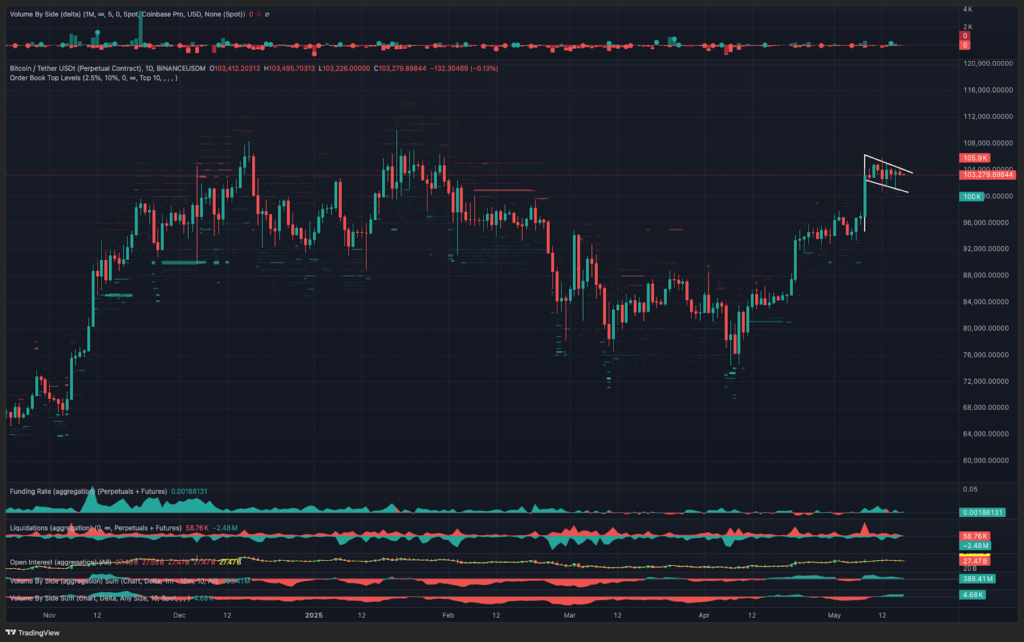 در حالی که بخش محدود و افقی این الگو نشاندهنده تردید خریداران و فروشندگان است، در این شرایط خاص، نبود حجم خرید کافی بهعنوان عامل اصلی این رفتار قیمت شناخته میشود. بر اساس دادههای نمودار TRDR.io، حرکت انفجاری بیت کوین از ۷۴,۴۰۰ دلار به ۱۰۵,۹۰۰ دلار با حجم بالای نقدینگی در بازارهای مارجین و حجم قابل توجه معاملات اسپات همزمان بوده است. این رویدادها در دورهای رخ دادند که ورود سرمایه به صندوقهای ETF اسپات بیت کوین طی چندین روز به میلیاردها دلار رسید.