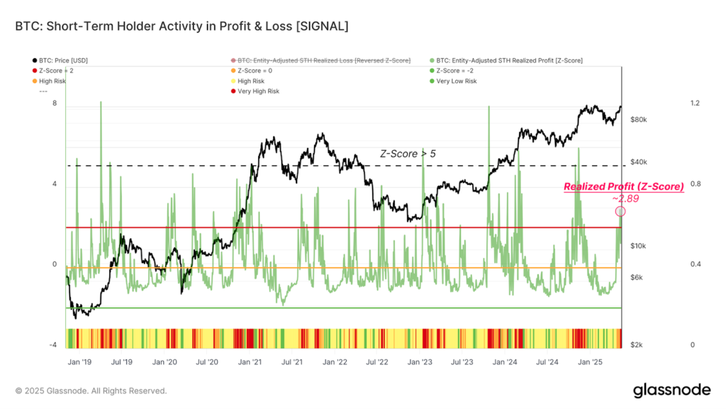 دادههای مربوط به سود و زیان هولدرهای کوتاهمدت بیت کوین که توسط شرکت تحلیل آنچین گلسنود ارائه شده، این دیدگاه را تأیید میکند. گلسنود بیان کرد که شناسایی سود توسط این دسته از هولدرها به حدود ۳ انحراف معیار بالاتر از میانگین ۹۰ روزه رسیده است. با این حال، این سطح هنوز به سطوح بالاتری که در دورههای صعودی گذشته و در مسیر رسیدن به سقف تاریخی تجربه شده بود (بیش از ۵ انحراف معیار) نرسیده است.