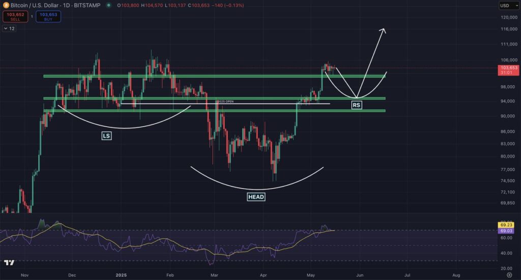 چاد (Chad) – تحلیلگر ارزهای دیجیتال – توییتی منتشر و دیدگاه تکنیکال جالبی را مطرح کرده است. او گفته که نمودار روزانه قیمت بیت کوین احتمالاً در مراحل ابتدایی ساخت شانه راست الگوی سر و شانه معکوس است. این الگو معمولاً پس از دورهای تثبیت قیمت ظاهر میشود و بهعنوان سیگنالی برای آغاز روند صعودی در نظر گرفته میشود.