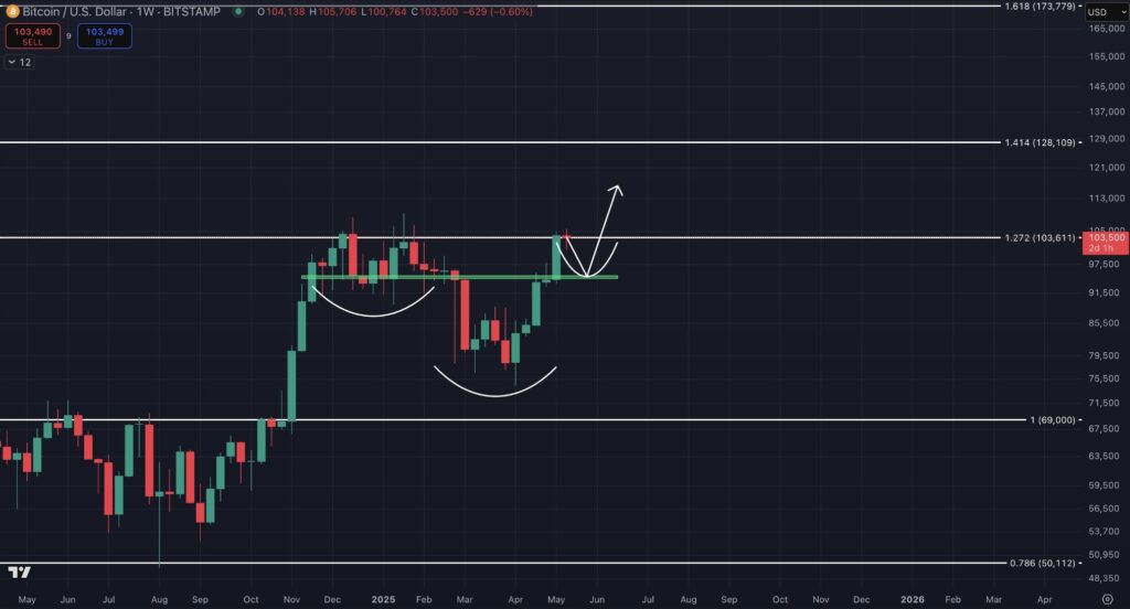 با این حال، یکی از عوامل مهم برای تایید این الگو، نحوه رفتار قیمت بیت کوین با سطح ۱.۲۷۲ فیبوناچی اکستنشن در نمودار لگاریتمی است. این سطح در تایمفریم هفتگی بهعنوان مقاومت اصلی عمل میکند. چاد گفته که باید دید آیا بیت کوین میتواند هفته را بالاتر از این سطح ببندد یا خیر. اگر این اتفاق رخ دهد، میتوان آن را نشانهای از قدرت روند صعودی و احتمال شروع یک شکست مهم دانست.
