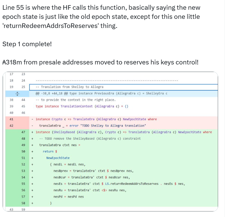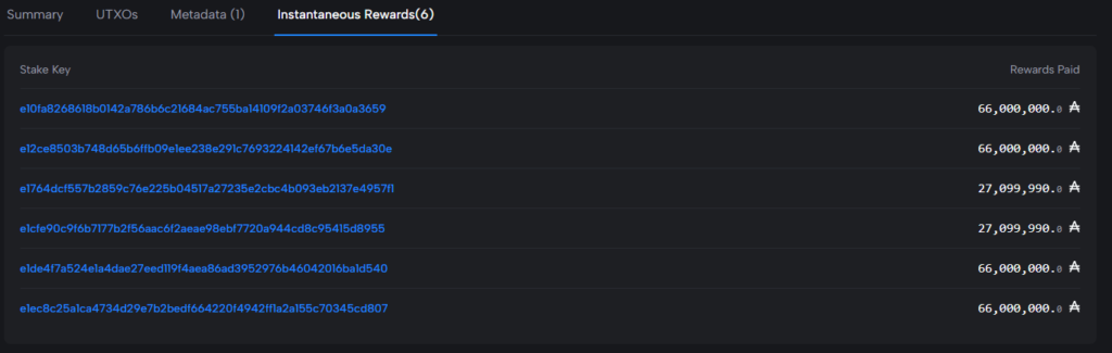 طبق اسناد، تراکنشی با عنوان «انتقال فوری پاداشها» (Move Instantaneous Rewards) در تاریخ ۲۴ اکتبر ۲۰۲۱ ثبت شده که طی آن بیش از ۳۱۸ میلیون توکن آدا از استخر ذخایر به بخشهای مربوط به استیکینگ یا خزانه منتقل شده است.
