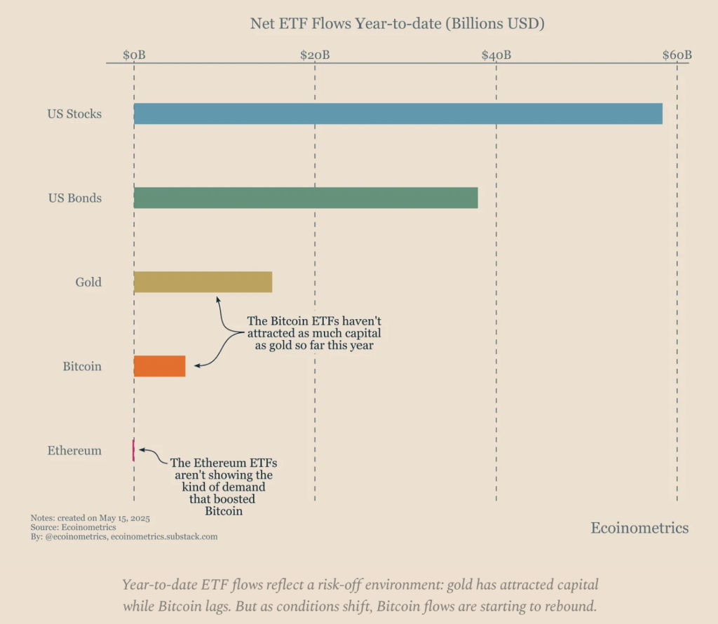 با وجود تثبیت جایگاه بیت کوین بهعنوان دارایی ذخیره ارزش در بالای ۱۰۰,۰۰۰ دلار، نشریه اقتصاد کلان Ecoinometrics گزارش داده که سهماهه اول ۲۰۲۵ برای بیت کوین بدون چالش نبود. در سال ۲۰۲۴، صندوقهای ETF اسپات بیت کوین شاهد ۳۵ میلیارد دلار ورود خالص سرمایه و خرید ۵۰۰,۰۰۰ بیت کوین بودند که منجر به رشد ۱۲۰٪ شد؛ اما در چهار ماه اول ۲۰۲۵، این میزان به کمتر از یکسوم کاهش یافت و در مقابل، ETFهای طلا جذب سرمایه بیشتری داشتند.