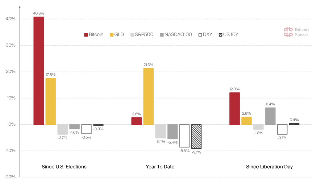 بازده طلا در سال ۲۰۲۵ تاکنون ۳۰.۳۳٪ و بازده بیت کوین ۳.۸۴٪ بوده است. با این حال، تحلیلگران معتقدند بیت کوین بهعنوان دارایی رشد با بتای بالا (high-beta) عملکرد بهتری در شرایط نقدینگی افزایشی و تضعیف ارزهای فیات دارد.