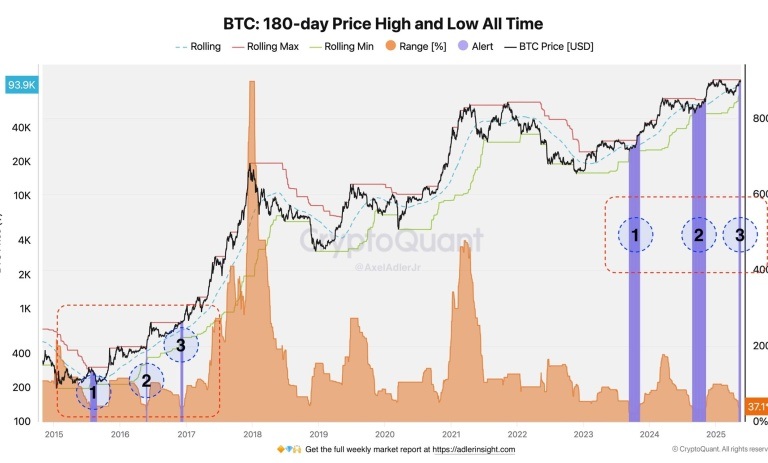 از سوی دیگر، تحلیلگر بازار «اکسل آدلر جونیور» به الگوی فشردگی (Compression) در نمودار ۱۸۰ روزه قیمت بیت کوین اشاره کرده است. این الگو که با مقایسه بیشینه و کمینه قیمت در بازه نیمساله محاسبه میشود، در سالهای ۲۰۱۷ و ۲۰۲۱ نیز پیش از جهشهای بزرگ مشاهده شده بود. سومین دوره فشردگی کنونی، شباهت زیادی به چرخه صعودی سال ۲۰۱۷ دارد که با کاهش عرضه، هیجان خریداران خرد و جهشهای سریع قیمت همراه بود.
