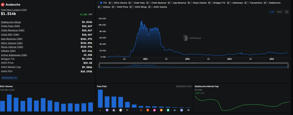 بر اساس دادههای وبسایت دیفایلاما (DefiLlama)، ارزش کل قفلشده (TVL) در شبکه آوالانچ تا روز گذشته حدود ۱.۵ میلیارد دلار بوده است.