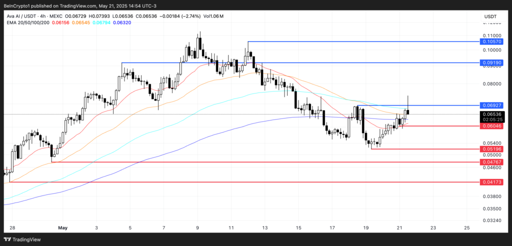 بررسیهای تکنیکال نشان میدهد که شاخصهای میانگین متحرک نمایی (EMA) به سمت تشکیل الگوی تقاطع طلایی حرکت میکنند که سیگنالی صعودی بهشمار میرود. اگر این روند ادامه یابد، AVA میتواند مقاومت ۰.۰۶۹ دلاری را آزمایش کند. در صورت شکست این سطح، اهداف بعدی ۰.۰۹۱۹ و حتی ۰.۱۵ دلار خواهند بود.