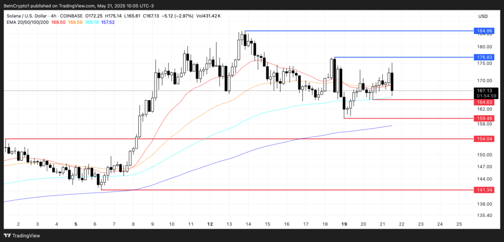از لحاظ تکنیکال، حمایت ۱۶۴ دلاری فعلاً حفظ شده است. اگر این سطح حفظ شود، احتمال صعود قیمت سولانا تا ۱۷۶.۸۶ و سپس ۱۸۴.۸۶ دلار وجود دارد. اما اگر سطح ۱۶۴ دلار شکسته شود، حمایتهای بعدی در سطوح ۱۵۹.۴۸، ۱۵۴ و ۱۴۱ دلار قرار دارند.