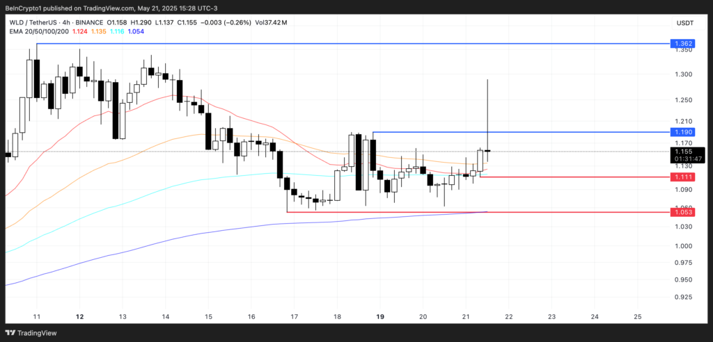 قیمت ورلد کوین در ۲۴ ساعت گذشته ۱۳.۶٪ رشد کرده است. شاخصهای EMA نشان میدهند که امکان شکلگیری تقاطع طلایی وجود داشته که نشانهای صعودی است.