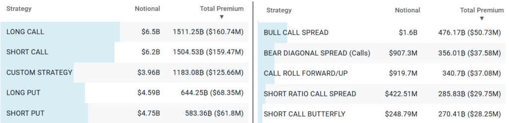 در دو هفته گذشته، یکی از مهمترین استراتژیهایی که در صرافی دریبیت (Deribit) معامله شده، «شورت کال» بوده است؛ این استراتژی را سرمایهگذاران برای کسب درآمد ثابت، در صورت حفظ قیمت بیت کوین بالاتر از یک سطح خاص، استفاده میکنند. همچنین، استراتژی بول کال اسپرد (bull call spread) نیز دیده میشود که در آن معاملهگر با قربانیکردن بخشی از سود در سطوح بالاتر، از ریسک نزول محافظت میکند.