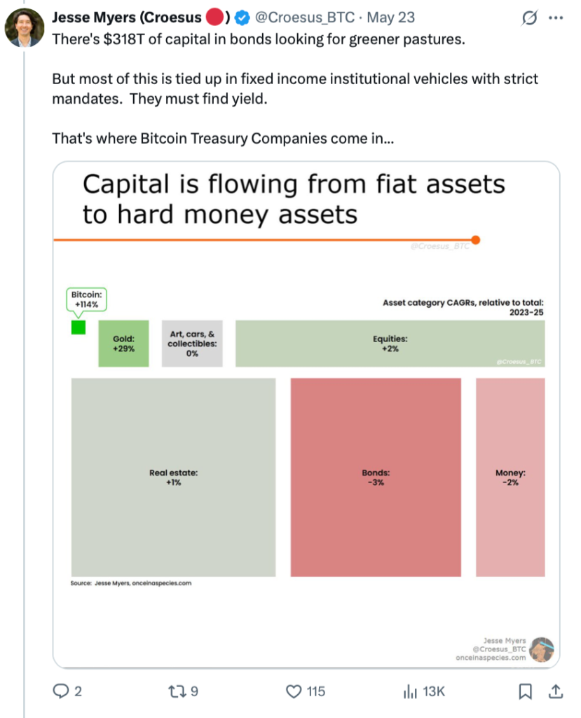 اینجاست که شرکتهای خزانهداری بیتکوین وارد میدان میشوند. این شرکتها در دهههای آینده، خریداران اصلی بیتکوین خواهند بود و حجم عظیمی از سرمایههای در جستجوی حفظ ارزش را به سمت بیتکوین هدایت خواهند کرد.