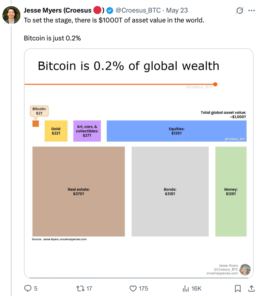در حال حاضر، مجموع ارزش داراییهای جهان در حدود ۱٬۰۰۰ تریلیون دلار است، و بیت کوین تنها ۰.۲٪ از این رقم را شامل میشود.