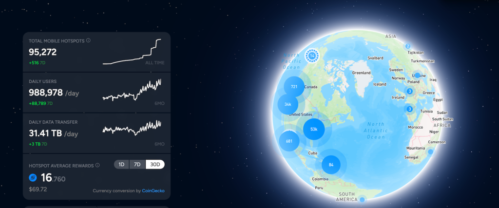 طبق دادههای شبکه هلیوم، در حال حاضر آمریکا بیشترین تعداد از هاتاسپاتهای موبایل این شبکه را دارد. مجموع این هاتاسپاتها به ۹۵,۲۷۲ واحد رسیده است. علاوه بر این، تعداد هاتاسپاتهای فعال اینترنت اشیا در سراسر جهان به ۲۸۴,۰۵۳ عدد میرسد.