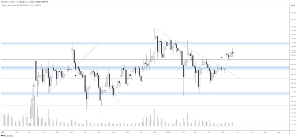 قیمت بیانبی (BNB) طی روزهای اخیر روند صعودی داشته و طبق تحلیل «کریپتورند» (Cryptorand)، روز یکشنبه به ۶۶۰ دلار رسید. این سطح حدود ۱۳٪ بالاتر از کف ماه جاری قرار دارد، اما همچنان اندکی پایینتر از سقف ماهانه ۶۹۲ دلار است. به گفته تحلیلگران، قیمت خرید BNB اخیراً موفق شده بالای یک خط روند نزولی بلندمدت که از دسامبر ۲۰۲۴ مقاومت ایجاد کرده بود، تثبیت شود.