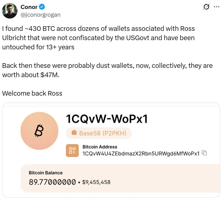 کانر گروگان (Conor Grogan)، مدیر شرکت کوینبیس (Coinbase)، در ماه ژانویه اعلام کرد که ۴۳۰ بیت کوین به ارزش بیش از ۴۵ میلیون دلار در کیفپولهایی که به گفته او با اولبریکت مرتبط هستند، یافته است. به گفته گروگان، این کیفپولها بیش از ۱۳ سال است که بدون فعالیت مانده و توسط مقامات ضبط نشدند.