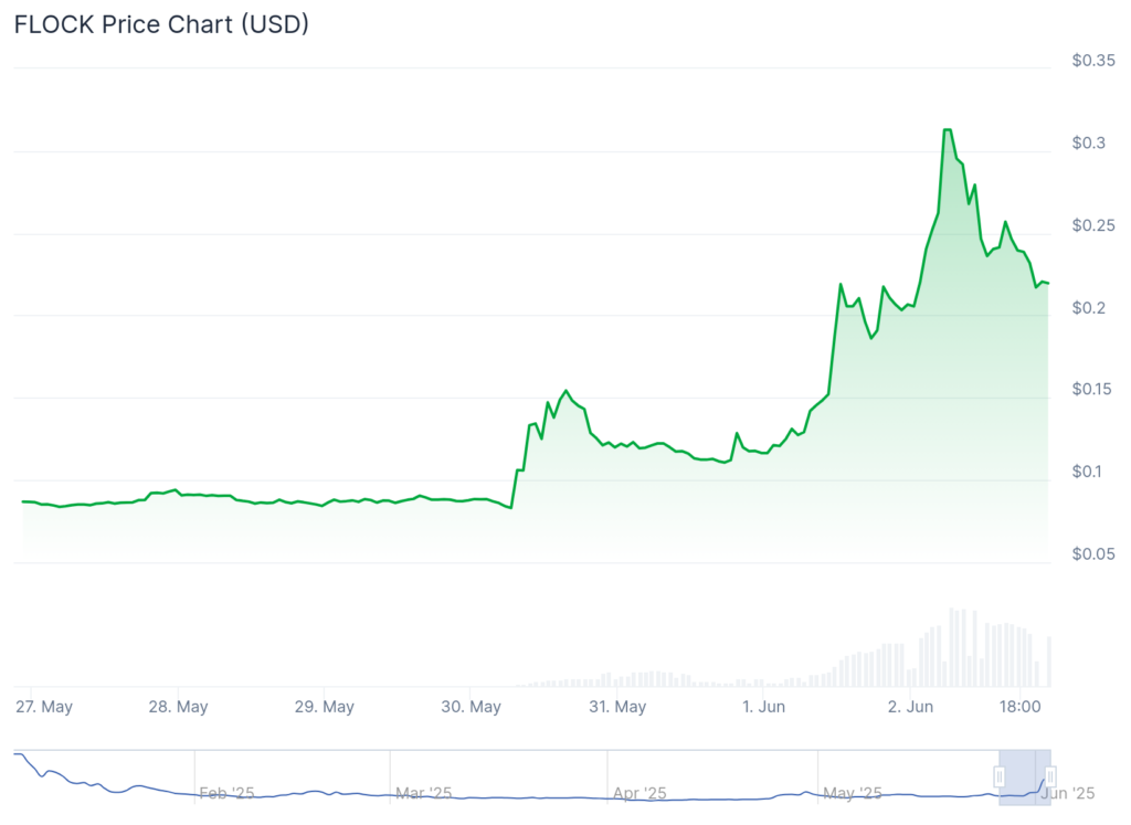 در حالی که بازار ارزهای دیجیتال در روزهای اخیر با نوسانات منفی همراه بوده، پروژه FLock.io با تمرکز بر آموزش مدلهای هوش مصنوعی، موفق شده با رشد خیرهکننده قیمت توکن بومی خود یعنی FLOCK توجهات را به خود جلب کند. قیمت این توکن طی یک هفته گذشته بیش از ۲۰۰٪ افزایش یافته و رشد سهرقمی قابلتوجهی را به ثبت رسانده است.