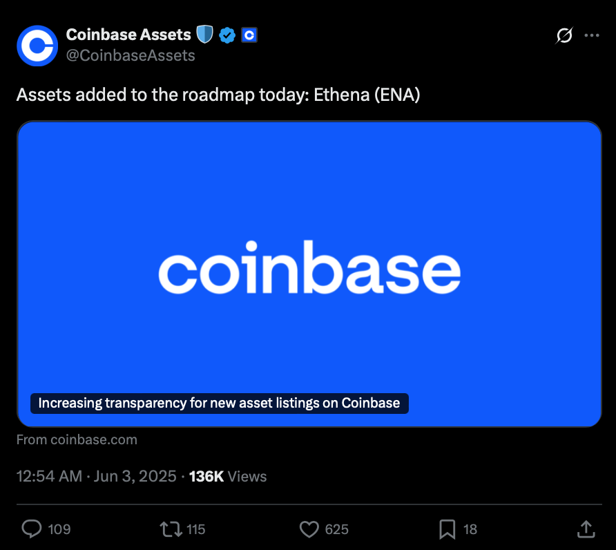 کوینبیس از قرار گرفتن ENA در رودمپ لیست شدن خبر داد – منبع: حساب Coinbase در X