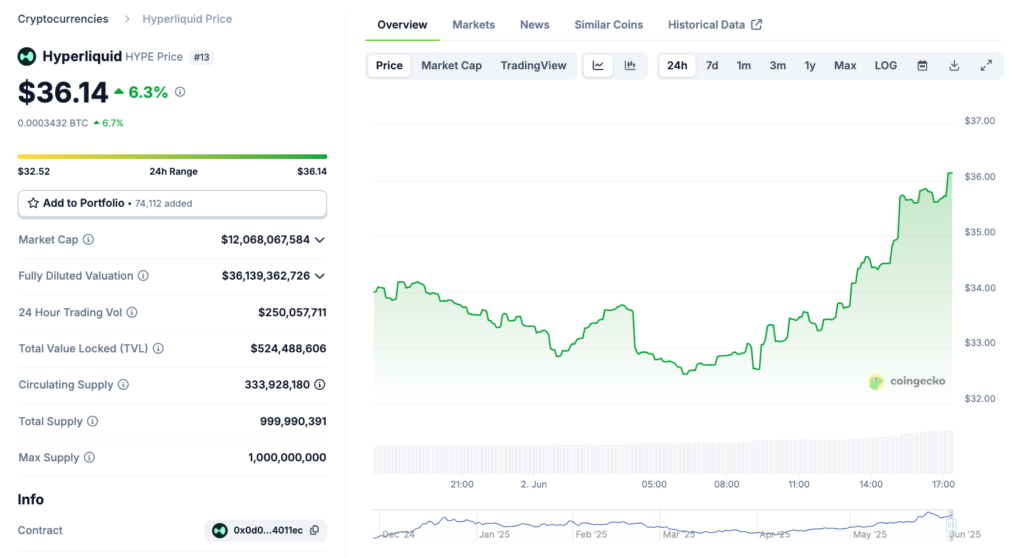 عملکرد قیمت توکن HYPE – منبع: CoinGecko