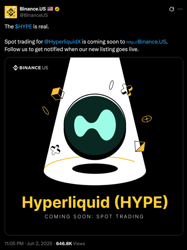 اطلاعیه لیست شدن توکن HYPE در شعبه آمریکایی بایننس – منبع: حساب Binance.US در X
