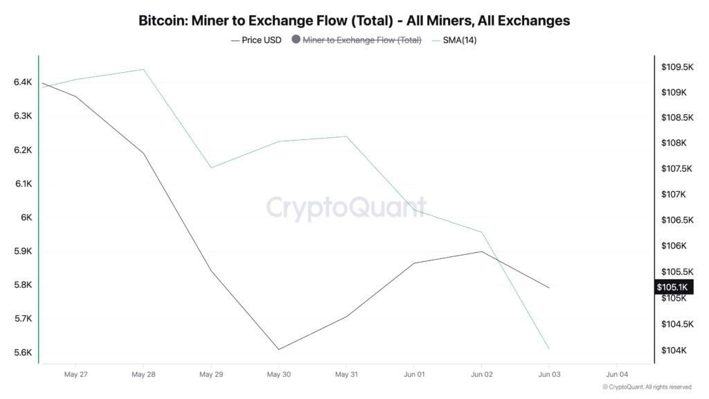 در سمت دیگر، شاخص جریان بیت کوین از ماینرها به صرافیها (BTC Miner-to-Exchange Flow) که حجم ارسال کوینها از کیفپول ماینرها به صرافیها را اندازهگیری میکند، در حال کاهش است. میانگین متحرک ۱۴ روزه این شاخص در طول هفت روز گذشته حدود ۱۴٪ کاهش یافته است.