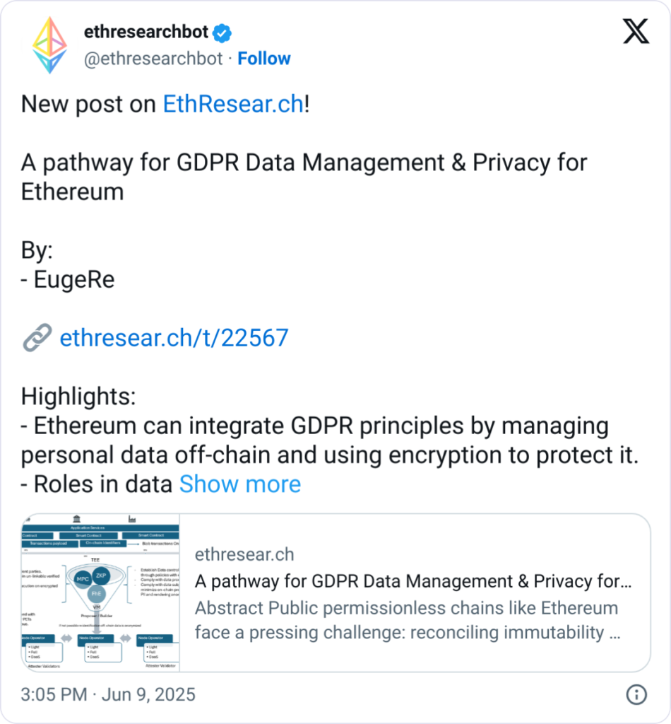 علاوه بر این، فناوریهایی مانند رمزنگاری کاملاً همومورفیک (Fully Homomorphic Encryption)، محیطهای اجرایی قابلاعتماد (Trusted Execution Environments یا TEEs)، محاسبات چندجانبه (Multiparty Computation یا MPC)، جداسازی پیشنهاددهنده-سازنده (Proposer-Builder Separation یا PBS) و نمونهبرداری همتا از در دسترس بودن دادهها (Peer Data Availability Sampling یا PeerDAS) نیز بهعنوان ابزارهایی معرفی شدهاند که میتوانند به انطباق اتریوم با GDPR کمک کنند.