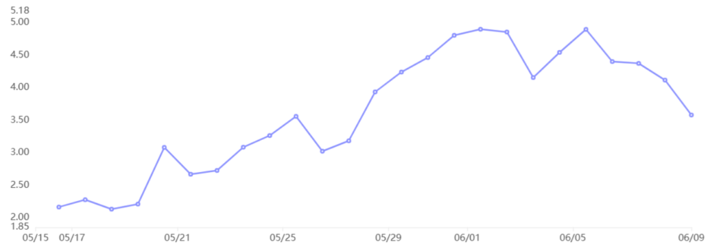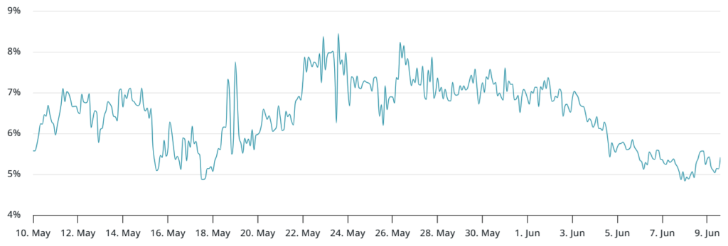 از ۶ ژوئن (۱۶ خرداد) تاکنون، پریمیوم قراردادهای آتی بیت کوین در حدود ۵٪ باقی مانده که معمول بازارهای خنثی است. رشد اخیر قیمت بهویژه با توجه به اینکه بیت کوین در حال حاضر تنها ۳٪ پایینتر از اوج تاریخی خود یعنی ۱۱۱٬۹۶۵ دلار در تاریخ ۲۲ می (۱ خرداد) معامله میشود، هنوز نتوانسته اعتماد معناداری در میان معاملهگران ایجاد کند. با این وجود، نمیتوان گفت که جو روانی بازار کاملاً بدبینانه است.