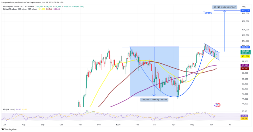 در الگوی فنجان و دسته، حرکت قیمت بیت کوین احتمال شکست صعودی به بالای سطح ۱۰۹,۰۰۰ دلار را نشان میدهد. تارگت این الگو نزدیک به ۱۴۳,۰۰۰ دلار است که حدود ۳۵٪ افزایش قیمت را نشان میدهد.