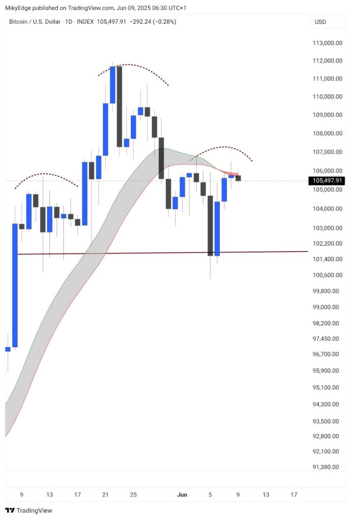میکیبول کریپتو (Mickybull Crypto) – تحلیلگر بازار – هم نظر مشابهی را بیان کرد. او اشاره کرد که الگوی سر و شانه در نمودار روزانه ظاهر شده و پیشبینی میکند که قیمت بیت کوین تا ۱۰۱,۵۰۰ دلار کاهش یابد. او گفت: